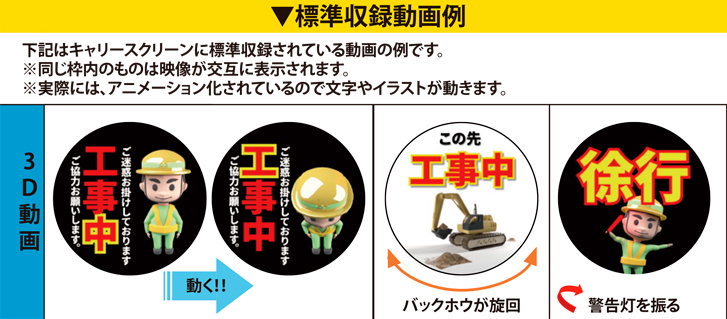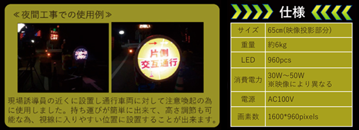工事現場の交通規制時の注意喚起や現場の工程表、完成イメージ図などを流して、現場のイメージアップ等にも使用することができます。投影したい映像はMP4、画像はJPEGであれば再生が可能です。